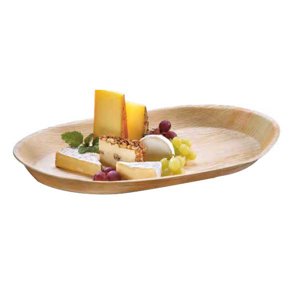 Bandeja oval de palmera de 48 x 24 x 4 cm. Estas bandejas tienen una veta natural que hace que aunque todos tengan la misma forma, sean todos distintos. La caja completa contiene 5 paquetes de 10 unidades.