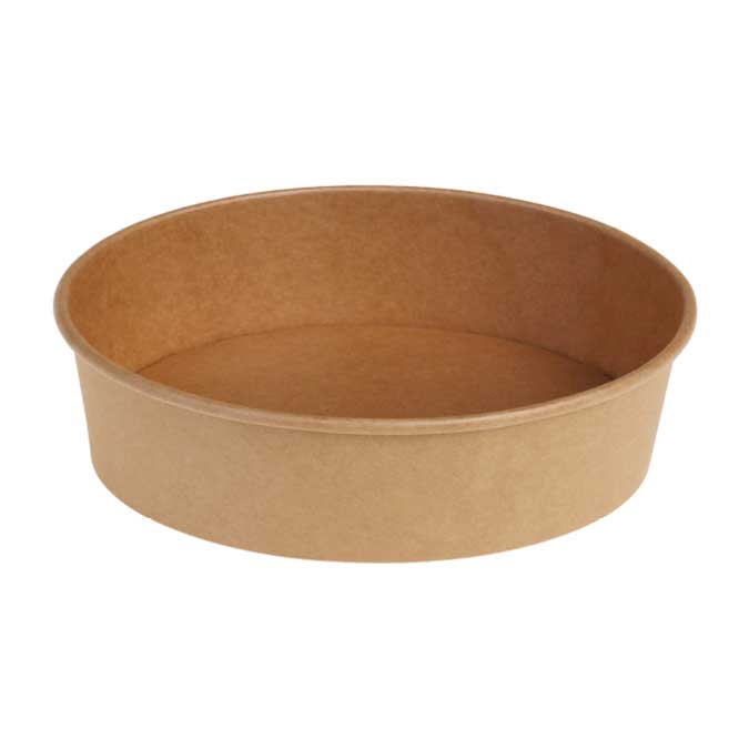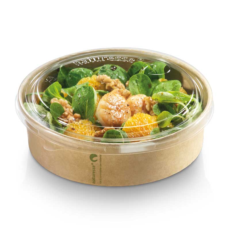 Las ensaladeras redondas de cartón en color kraft son el sustituto ideal a las tarrinas de plástico. Son más ecológicas y tansmiten una imagen modena a tu negocio.