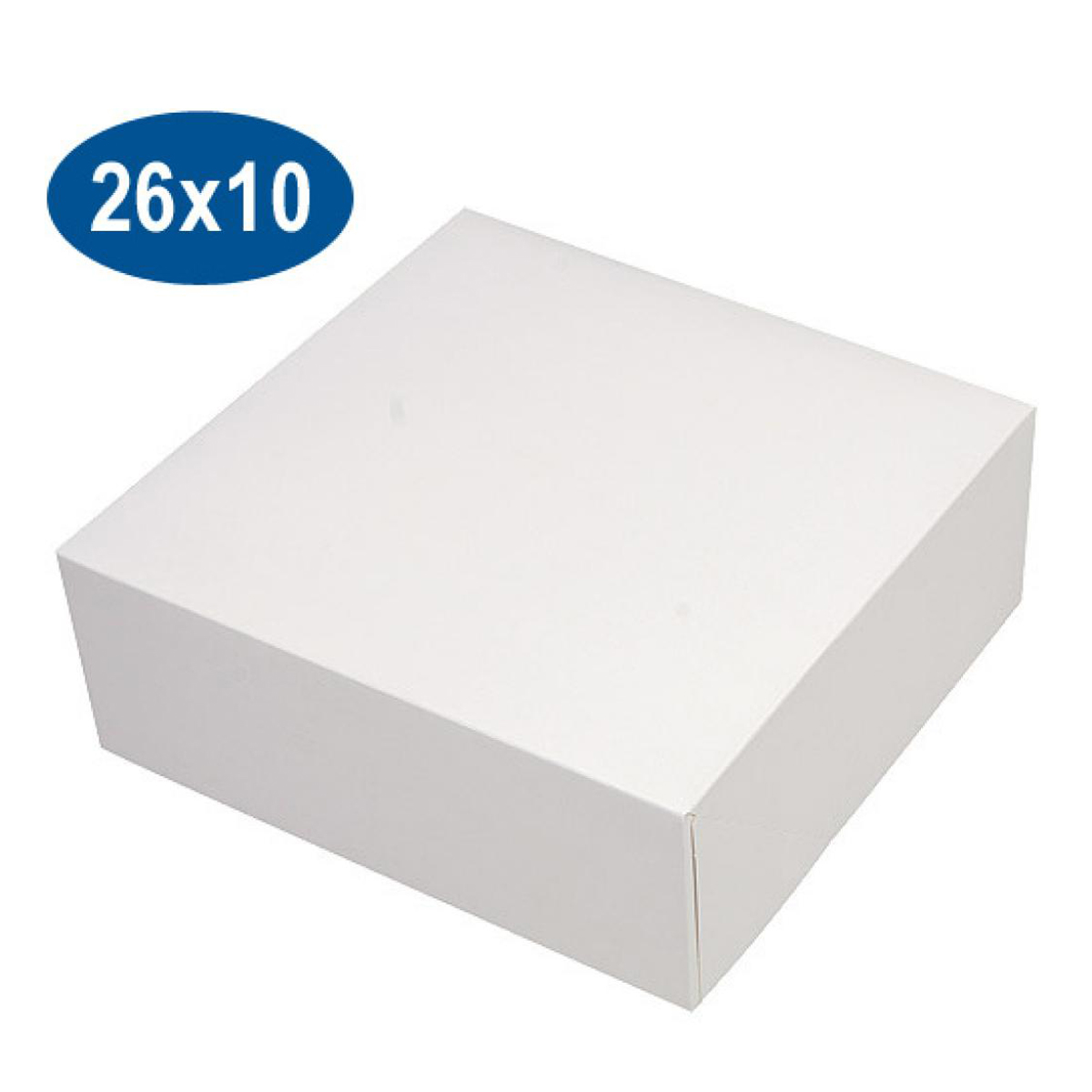Caja de cartón pastelería blanca cuadrada de 25 cms x 10 de altura, con su tapa incorporada, pensada inicialmente para pasteles y tartas, es un envase muy polivalente y cómodo. Y además es fácilmente personalizable con un sticker, disponemos de una amplia gama de diferentes tamaños para que encuentres tu caja ideal