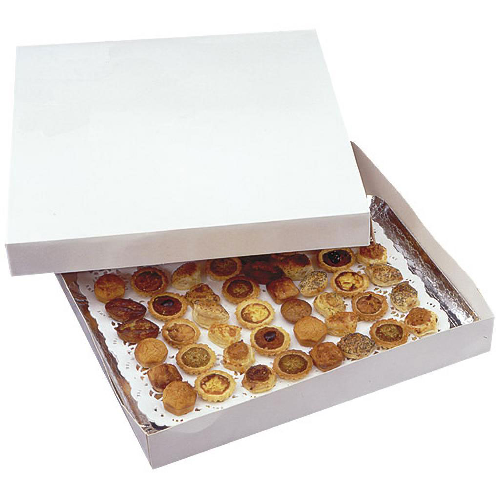 Caja de cartón pastelería blanca cuadrada de 40 cms x 8 de altura, con su tapa incorporada, pensada inicialmente para pasteles y tartas, es un envase muy polivalente y cómodo. Y además es fácilmente personalizable con un sticker, disponemos de una amplia gama de diferentes tamaños para que encuentres tu caja ideal