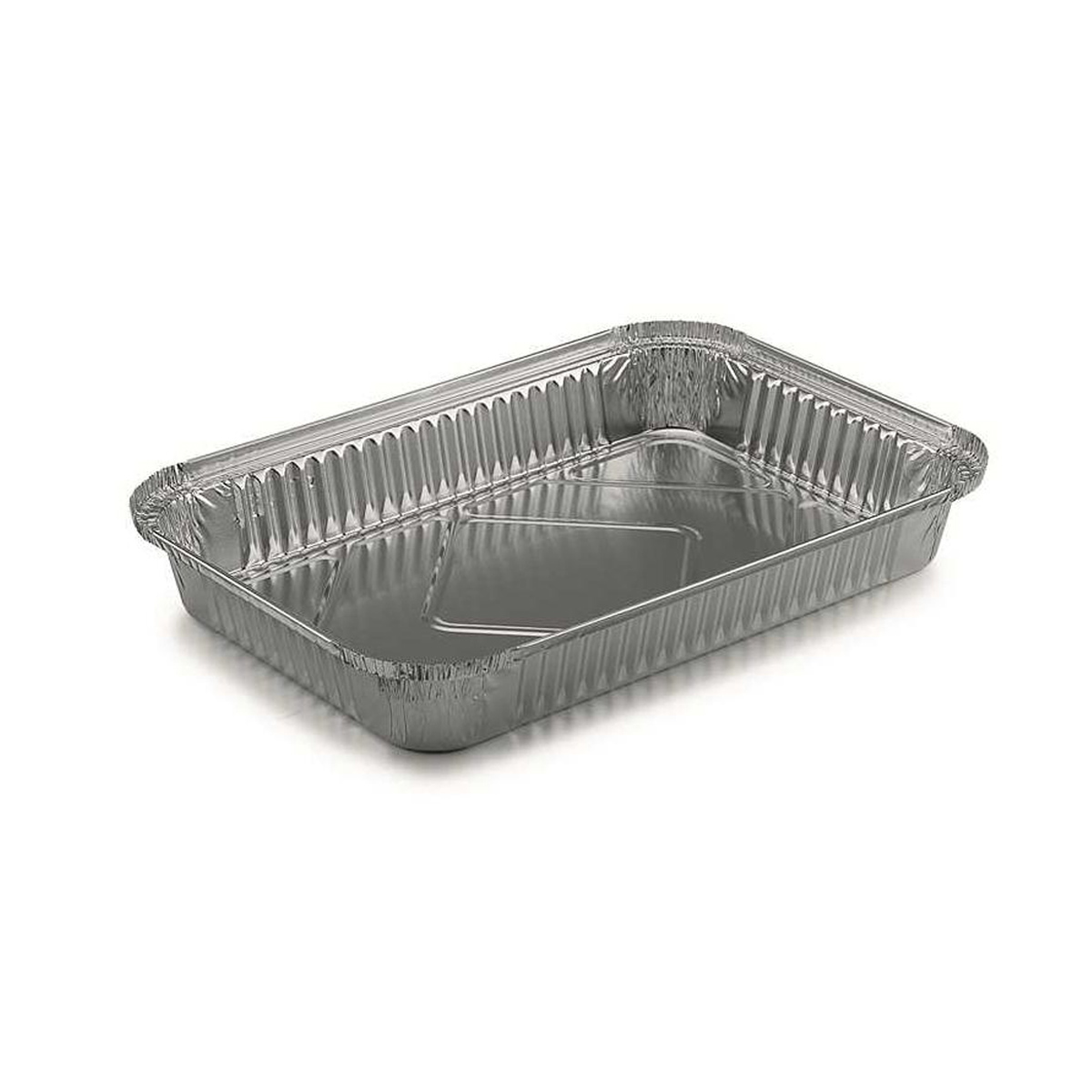 Envase rectangular de aluminio de capacidad 2.380 cc. Las medidas de la base son 280 x 176 mm y una altura de 39 mm. Tiene la posibilidad de cerrarse con tapa que se vende por separado. La caja completa contiene 10 paquetes de 100 unidades.