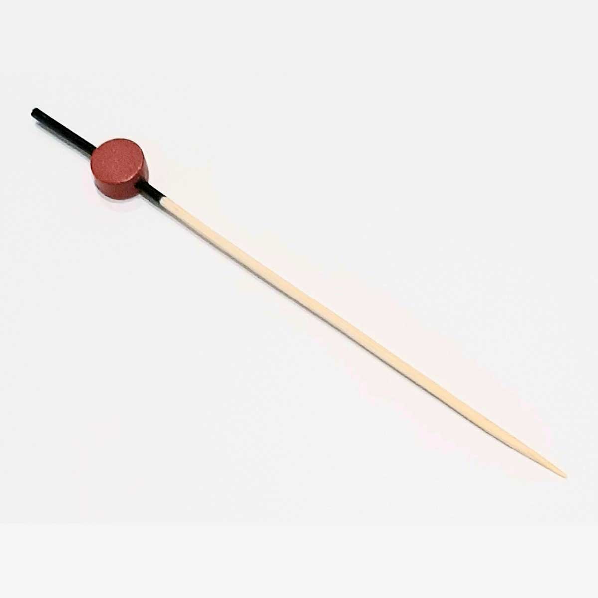 Brocheta de bambú de 12 cm, de color natural/rojo y negro. Perfecto para ensartar y distinguir tus pinchos y tapas. Ideal para caterings y eventos