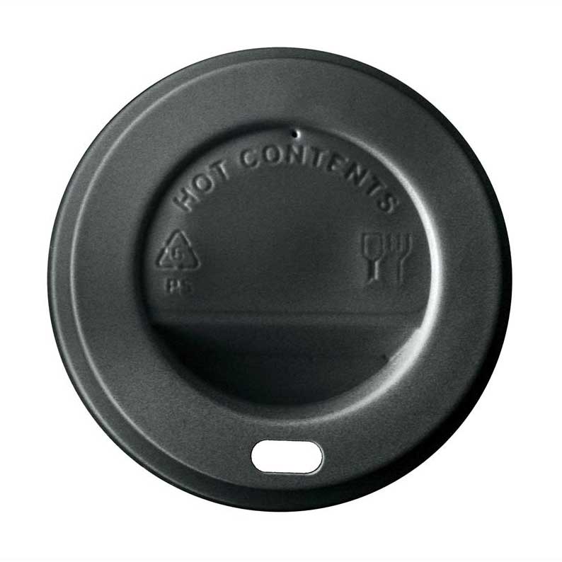 Tapa de PS negra con agujero, para vasos de cartón ref 4906_1, 4907_1. Permite cerrar los vasos para un correcto take away asegurando su contenido. La caja completa contiene 10 paquetes de 100 unidades.