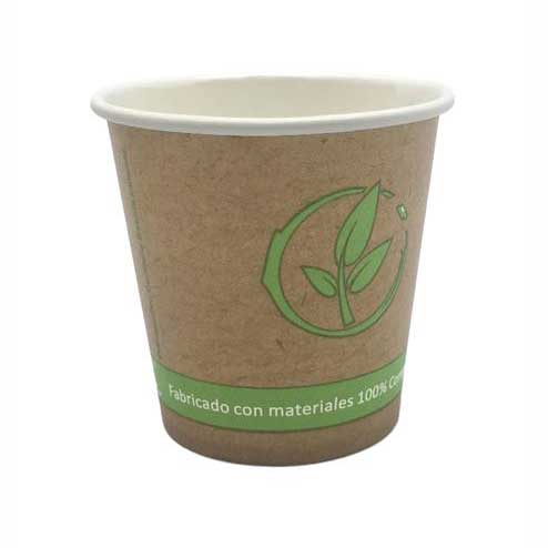 Vaso de cartón Kraft decorado con una película interior de PLA de 4oz, 120 ml. Es 100% biodegradable, ecológico y compostable. Su color natural va bien en todos los ambientes. La caja completa contiene 20 paquetes de 50 unidades.